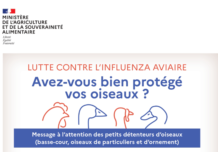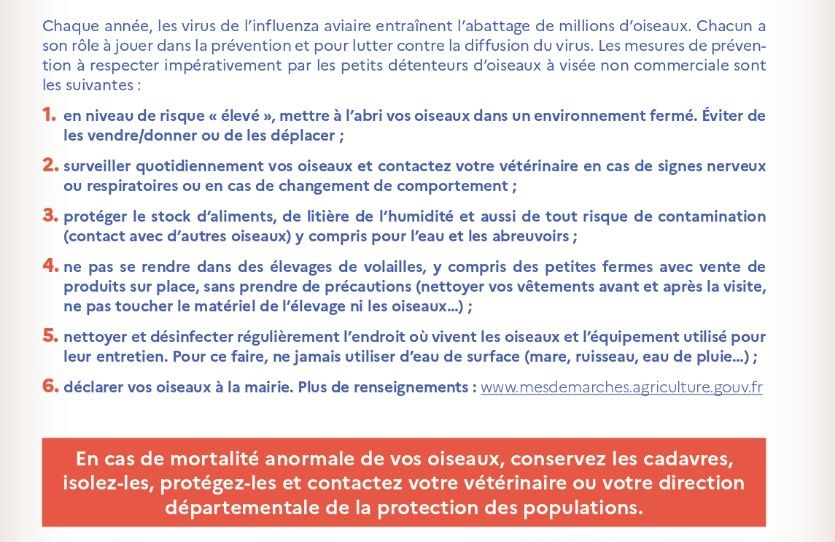Plus d'infos : https://agriculture.gouv.fr/influenza-aviaire-hautement-pathogene-la-france-place-son-territoire-en-niveau-de-risque-eleve